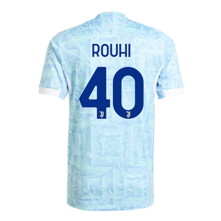 Buy Juventus Away ROUHI 40 Jersey 25-26 (Player Version). Show your support for Juventus with the latest Juventus Soccer Kits. Player version shirts, being slim fit, tend to run smaller than standard sizes. It is generally recommended to order at least one size larger than your usual size to ensure a comfortable fit.