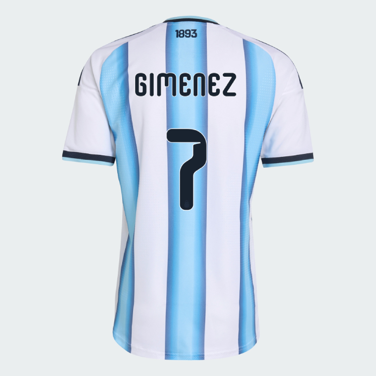 We provide Argentina Home GIMENEZ 7 World Cup Jersey 2026 (Player Version). Show your support for Argentina with the latest Argentina Soccer Kits. Player version shirts, being slim fit. It is generally recommended to order at least one size larger than your usual size.