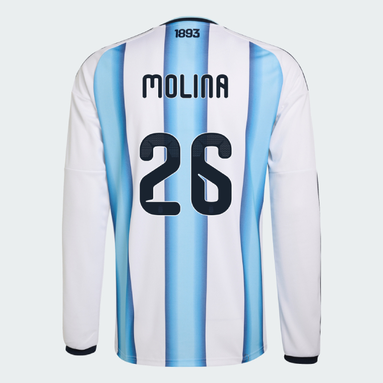 We provide Argentina Home MOLINA 26 World Cup Long Sleeve Jersey 2026 (Player Version). Show your support for Argentina with the latest Argentina Soccer Kits. Player version shirts, being slim fit. It is generally recommended to order at least one size larger than your usual size.