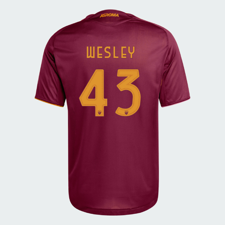 Buy AS Roma Home WESLEY 43 Jersey 25-26 (Player Version). Show your support for AS Roma with the latest AS Roma Soccer Kits. Player version shirts, being slim fit, tend to run smaller than standard sizes. It is generally recommended to order at least one size larger than your usual size to ensure a comfortable fit.